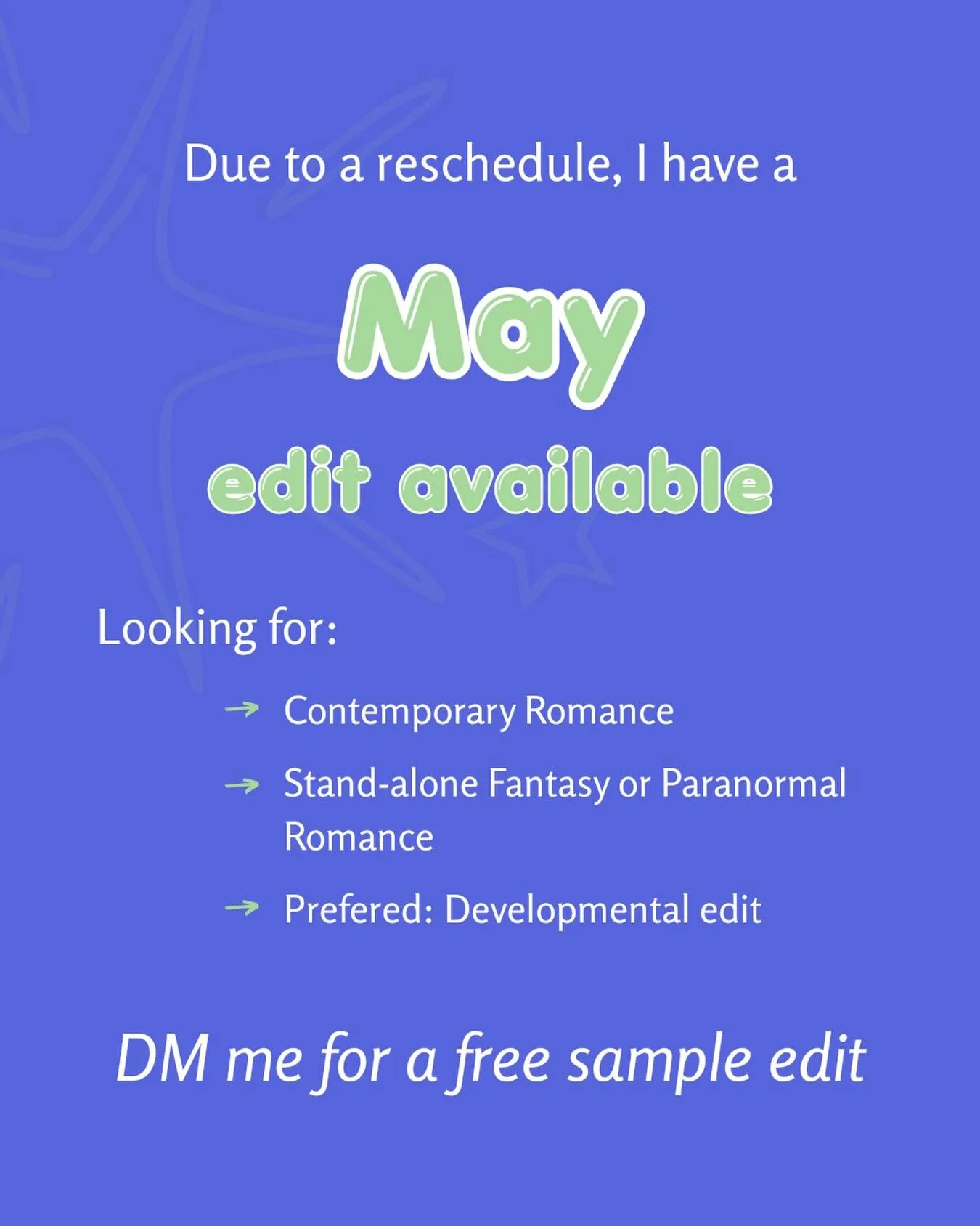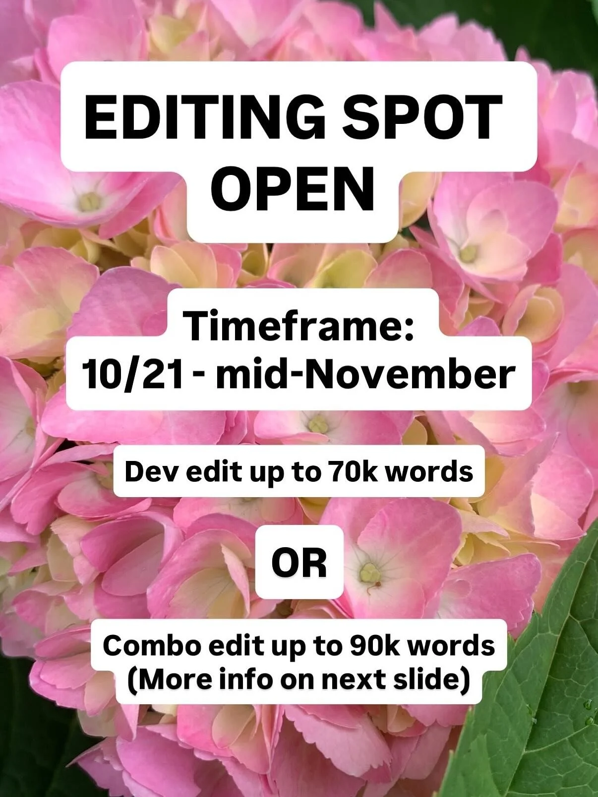 I edit romance and fantasy (all sub-genres except dark fantasy, religious, and historical).