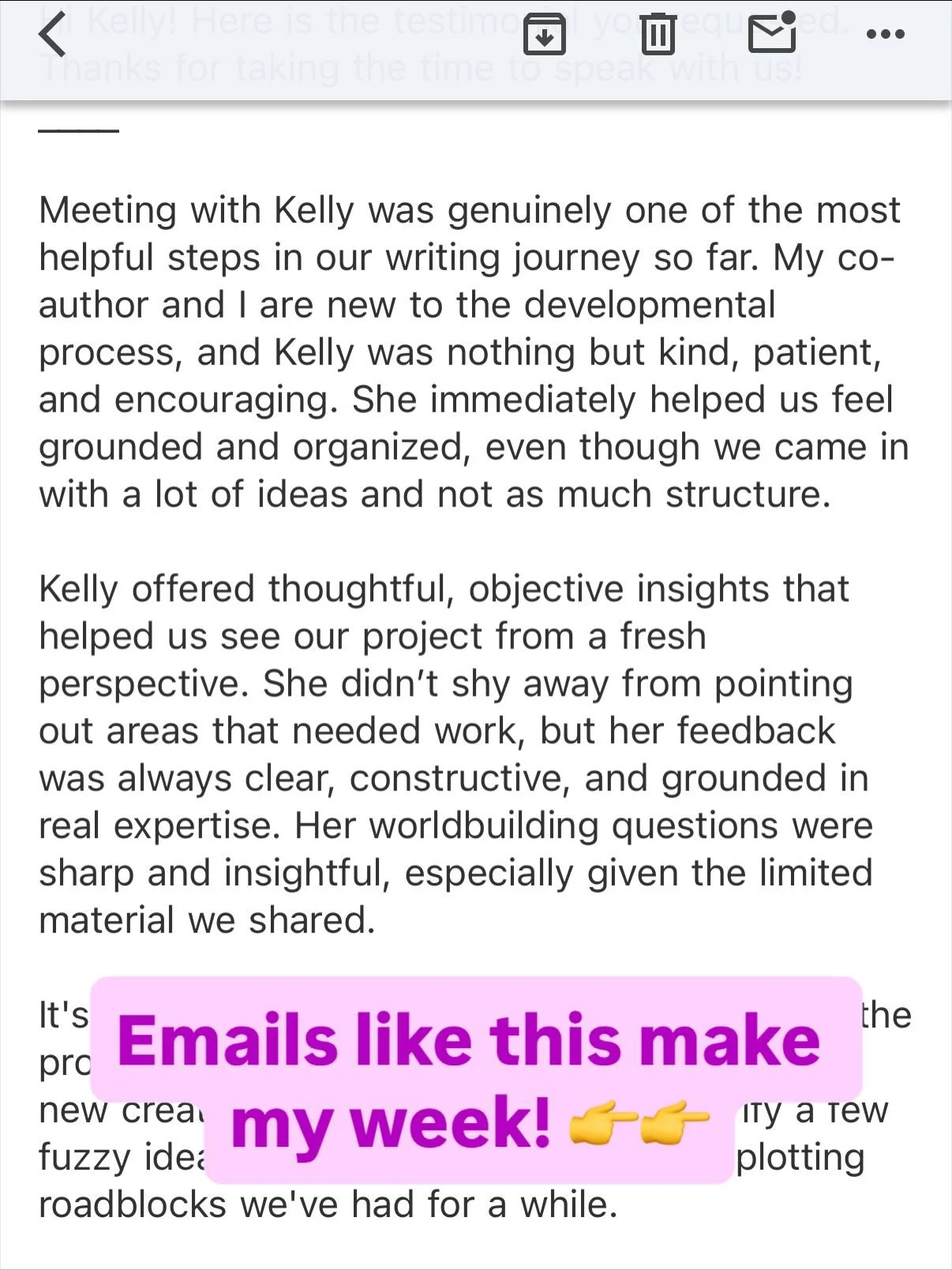 โ I really appreciate the way Kelly laid out the line-by-line edits for me with explanations for each suggestion or comment. As someone who struggles to write-to-market, Kelly helped me to catch some plot and character issues before I got too far along in the story; she saved me countless hours that would have been spent rewriting and fixing a plotline that just wasnโt working.โ