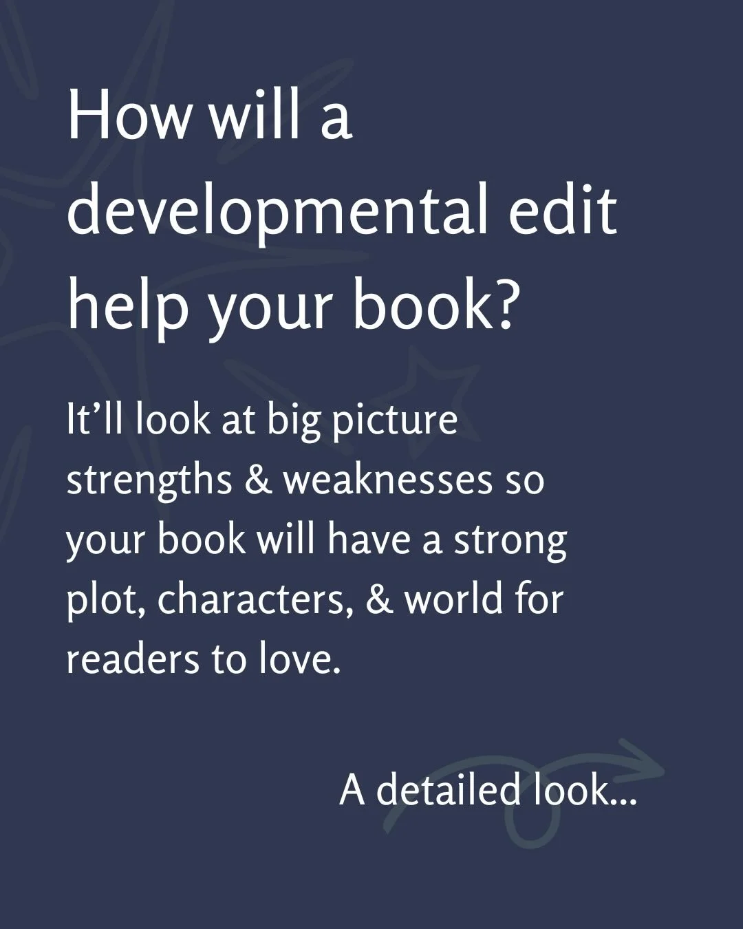 Developmental edits look at the big picture. This edit should take place BEFORE line edits or proofreading.