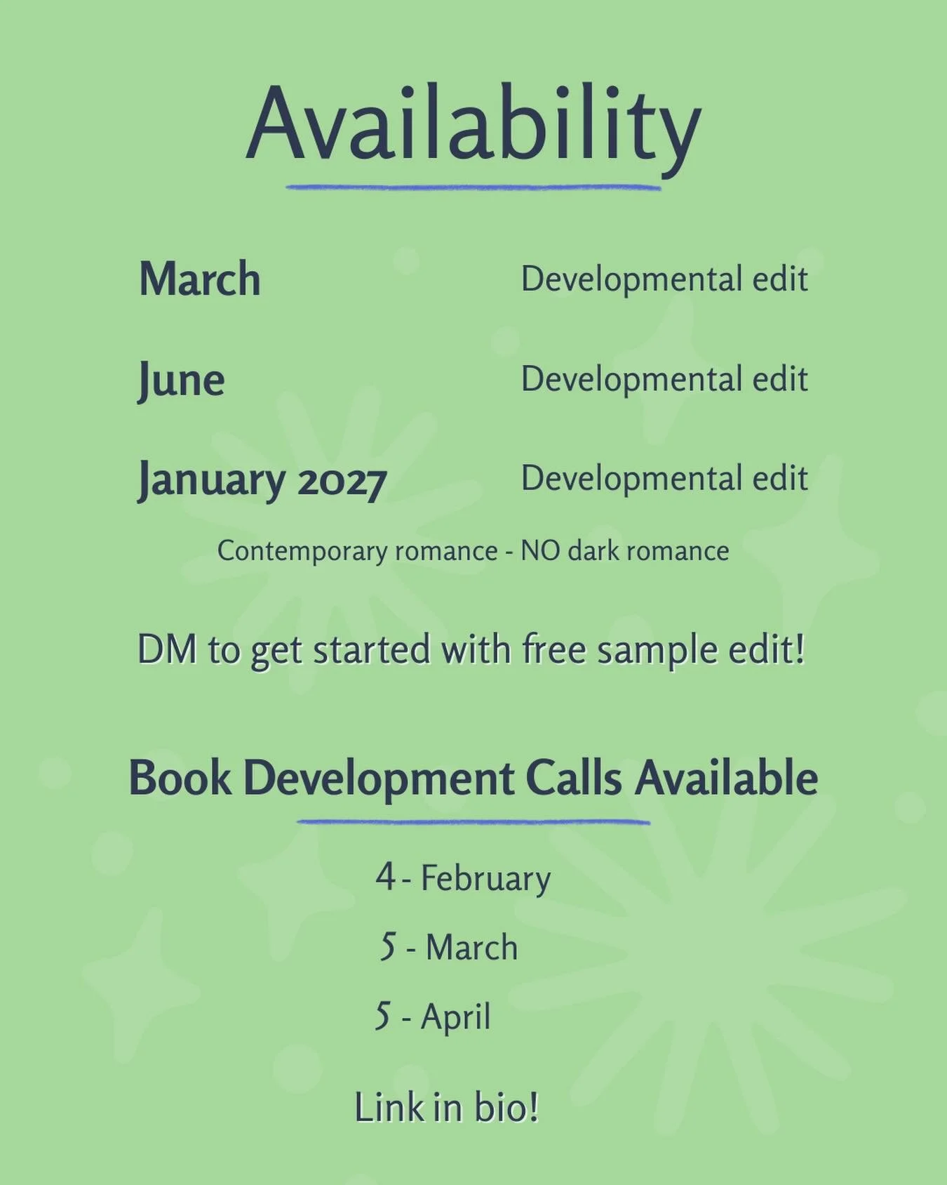 I hope to get your book back to you within 3-6 weeks depending on the word count. Obviously, longer books take longer to edit. So before you book with me, we’ll talk about timeframes to make sure you get your book back when you need it!