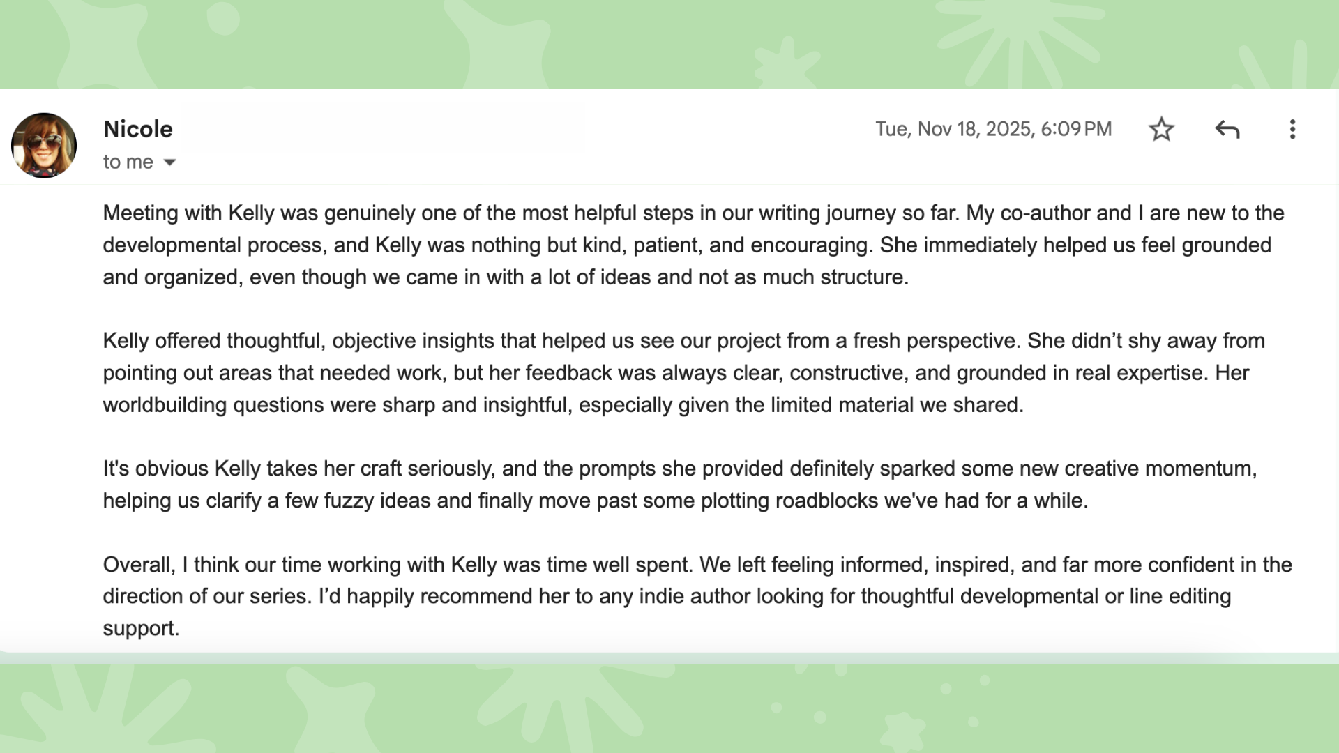 You’ll be working alongside an editor with over 40 books under her belt (including an International Best Seller). As an editor, I’ve helped my authors plug plot holes, rearrange their plot for better flow and/or pace, and develop their book from the ground up.